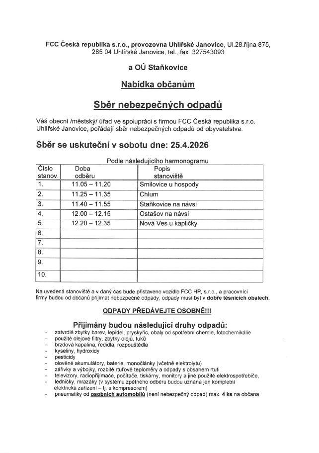 Na uvedená stanoviště a v daný čas bude přistaveno vozidlo FCC HP, s.r.o., a pracovníci